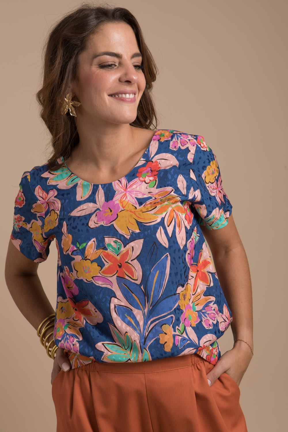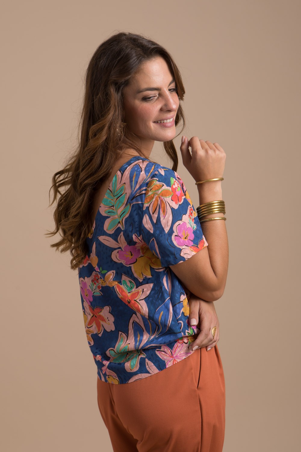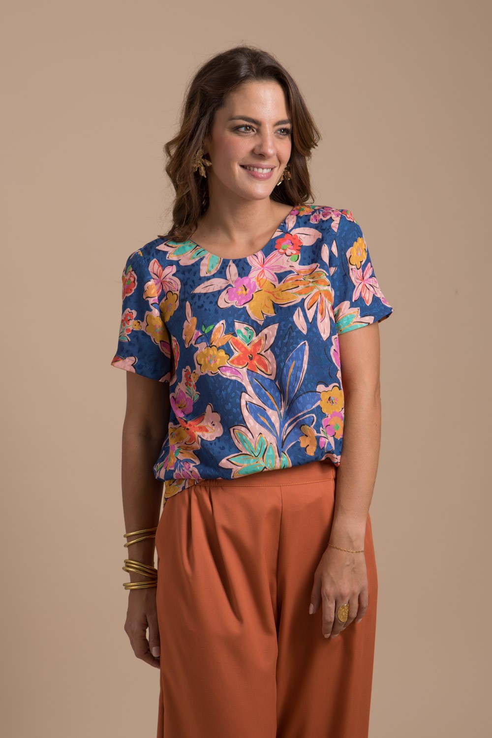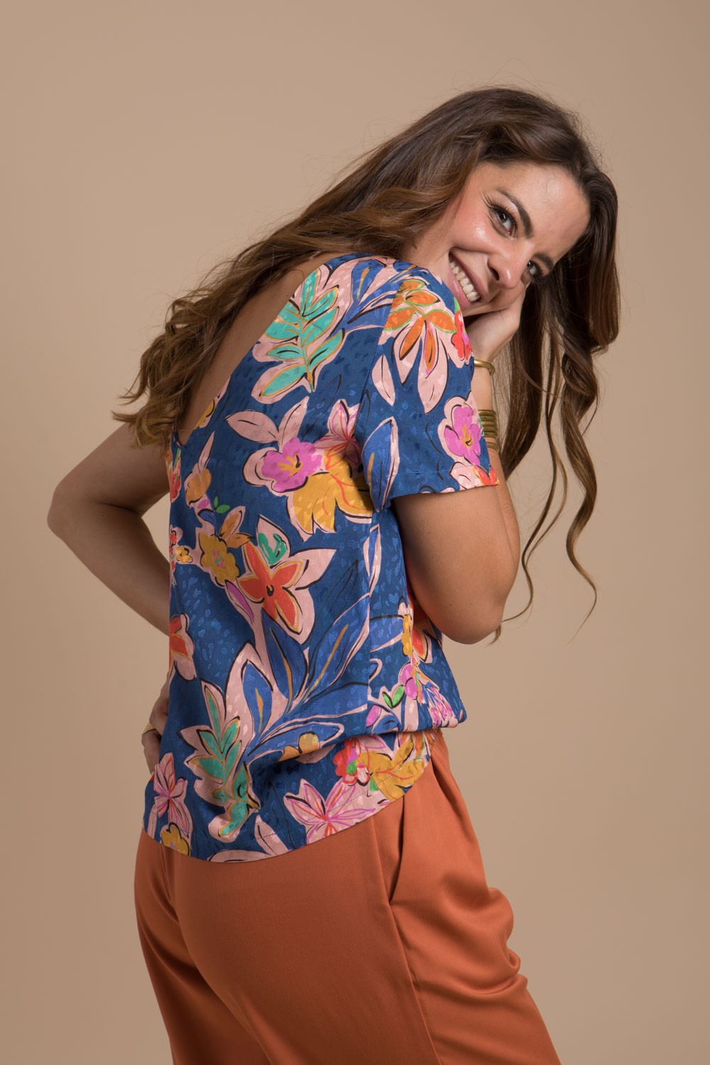 Blouse femme à manches courtes au dos décolleté est réversible conçue dans un beau tissu en viscose Ecovéro imprimé coloré agréable au touché, elle apporte confort et douceur sur la peau.