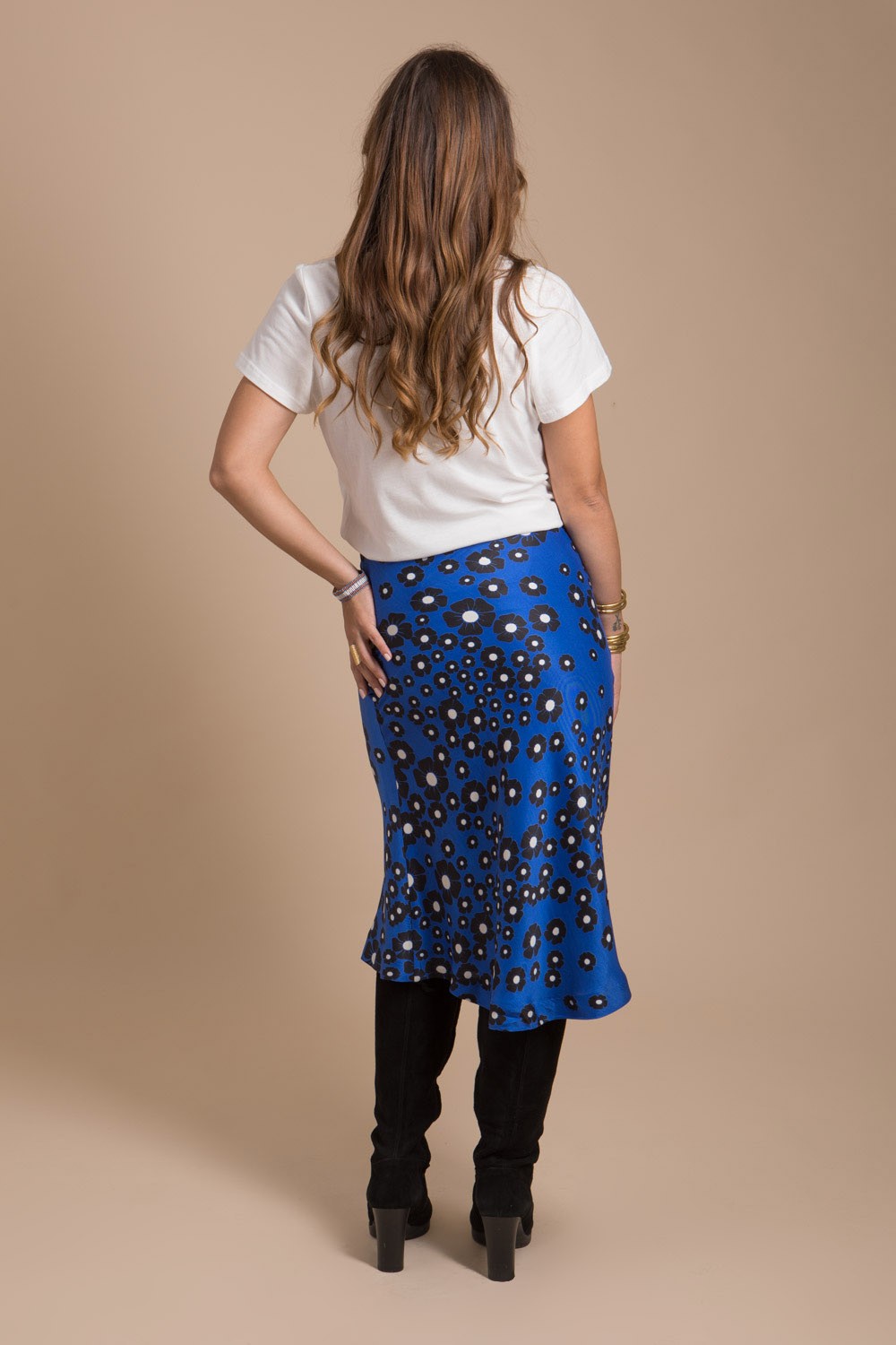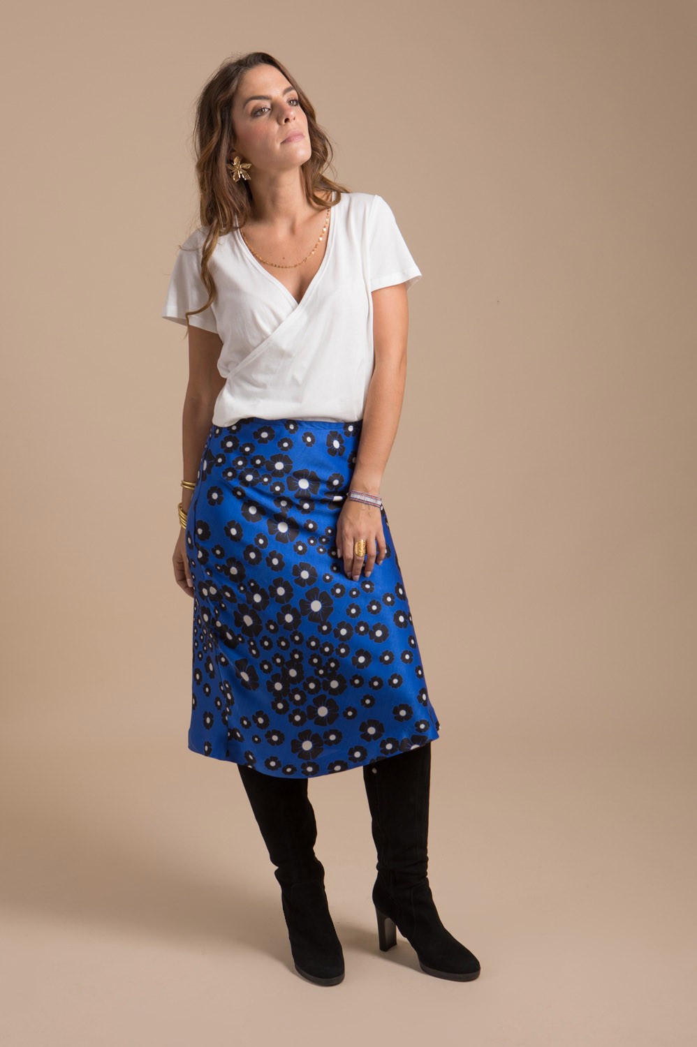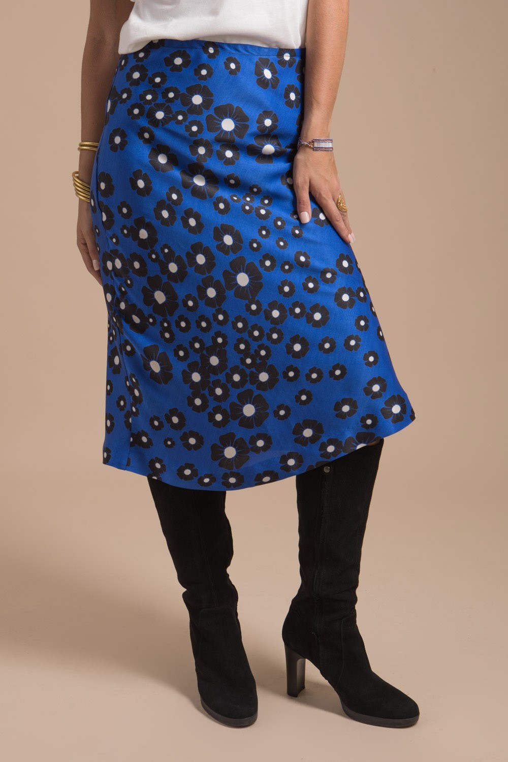 Jupe femme longueur midi en forme sirène confectionnée dans un tissu luxueux imprimé bleu satiné d’origine Français au tombé somptueuse. Cette jolie jupe est créée et fabriquée dans notre atelier en France.