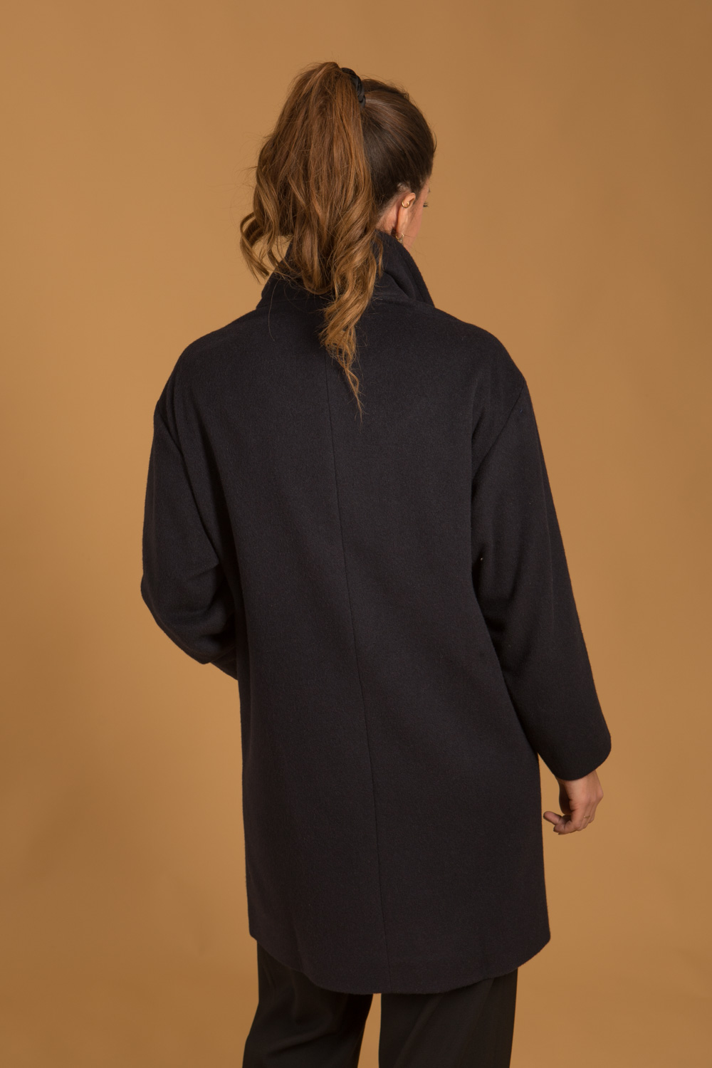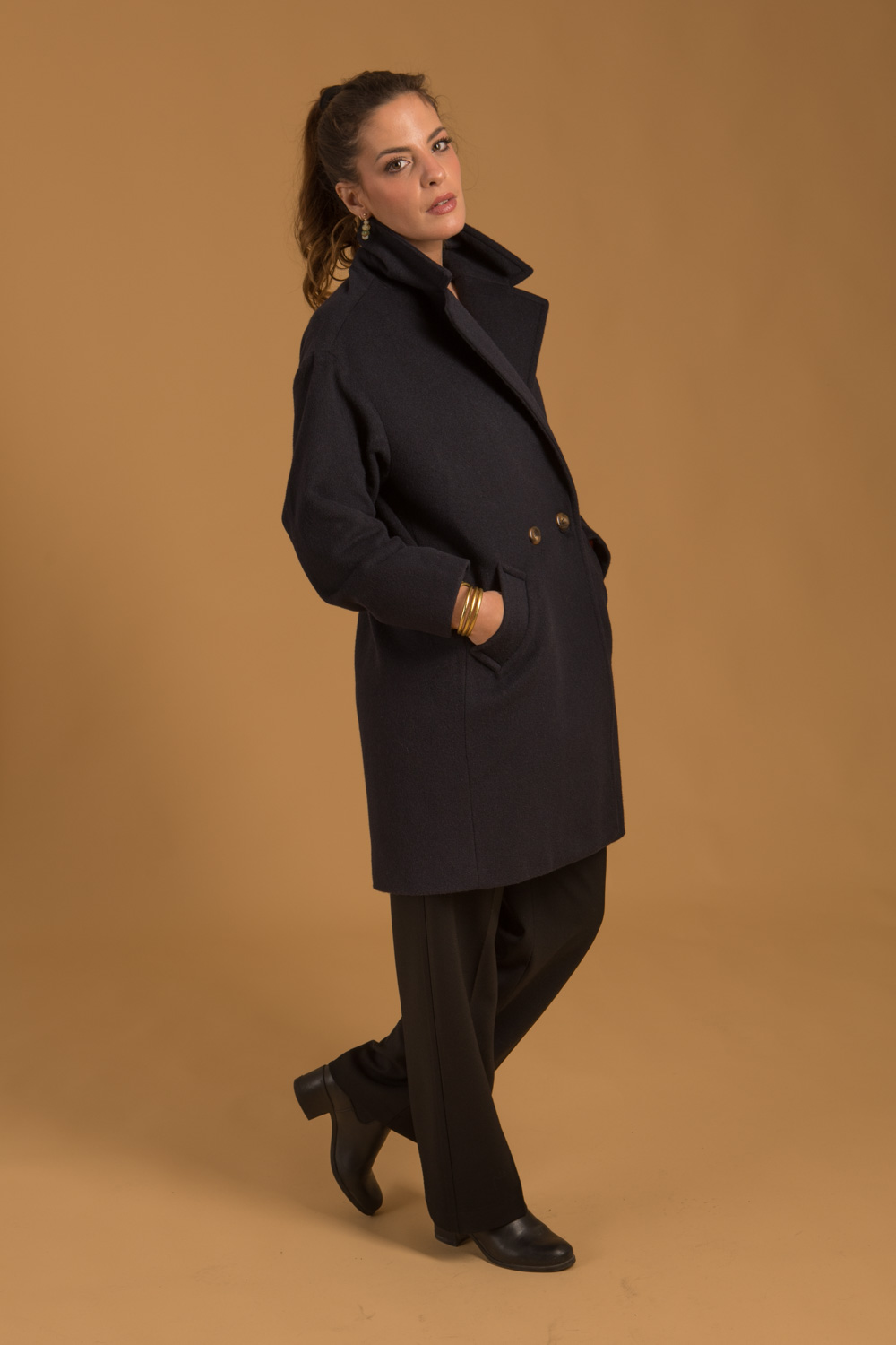 Manteau long femme réalisé dans un beau tissu en laine et cachemire couleur bleu nuit.