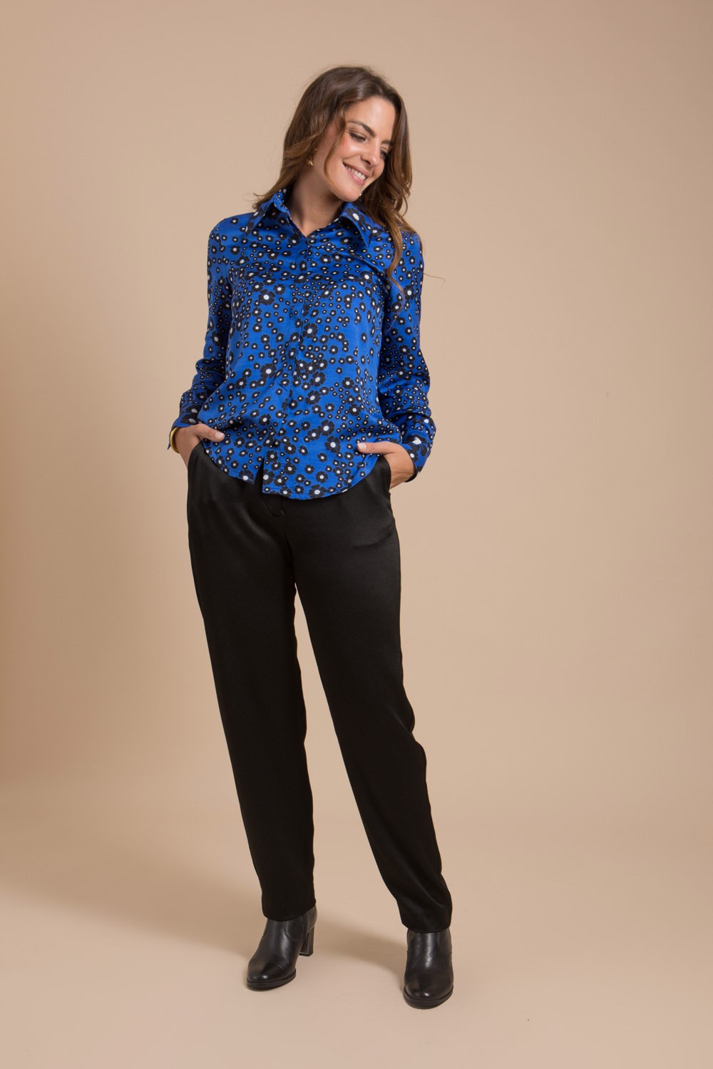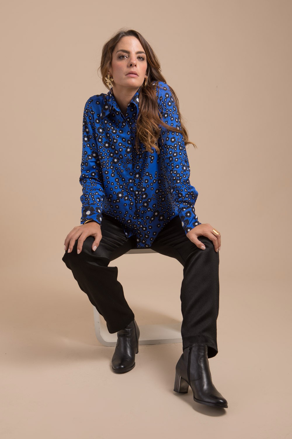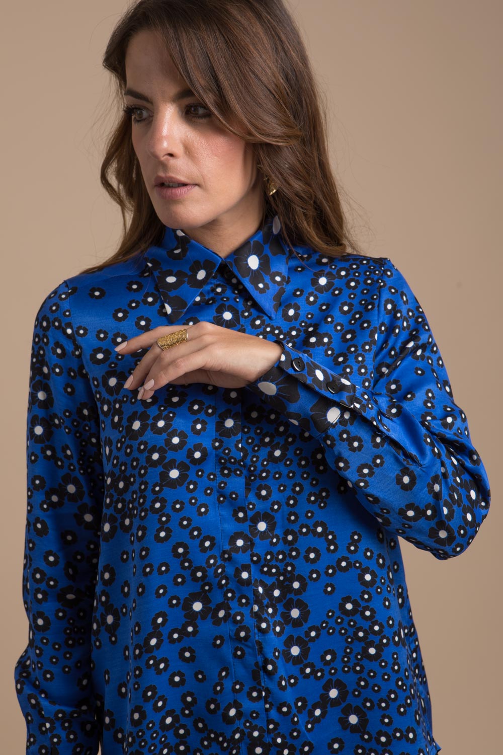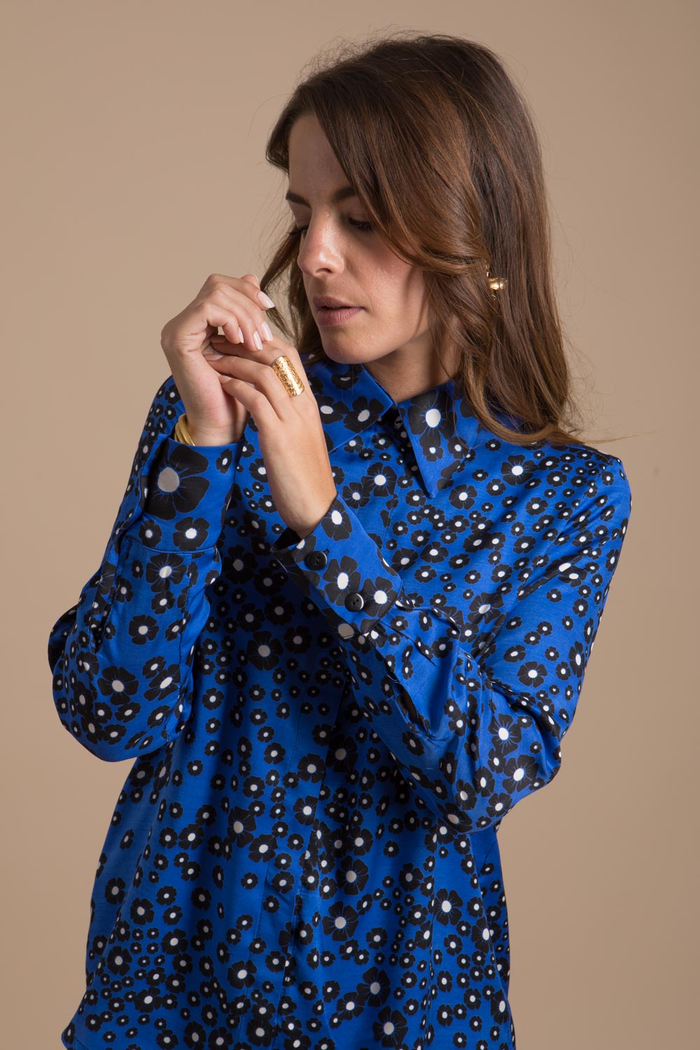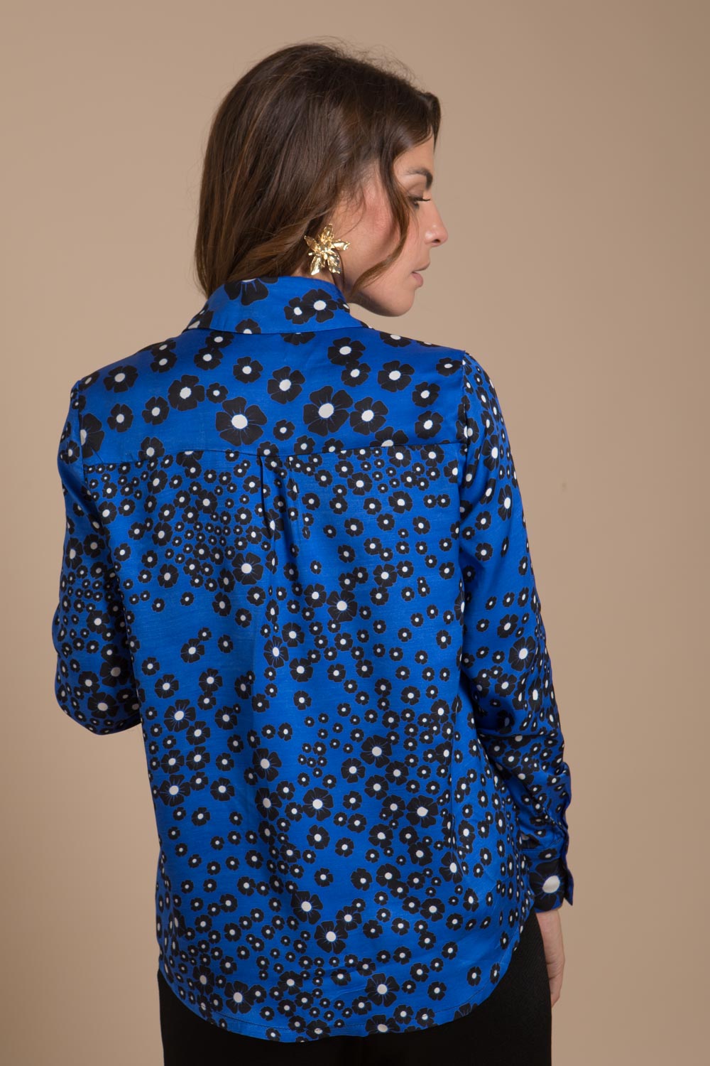 Chemise femme à manches longues à col classique. Conçue dans un beau tissu bleu en viscose Ecovéro imprimé délicat et agréable au toucher, il apporte confort et douceur sur la peau.